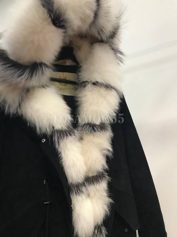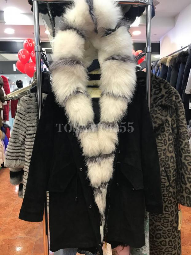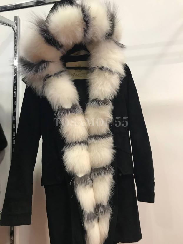 Черная укороченная парка с белым мехом енота