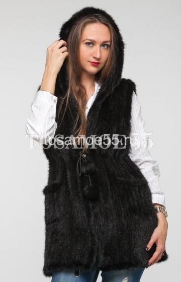 Серая жилетка из вязаной норки с капюшоном